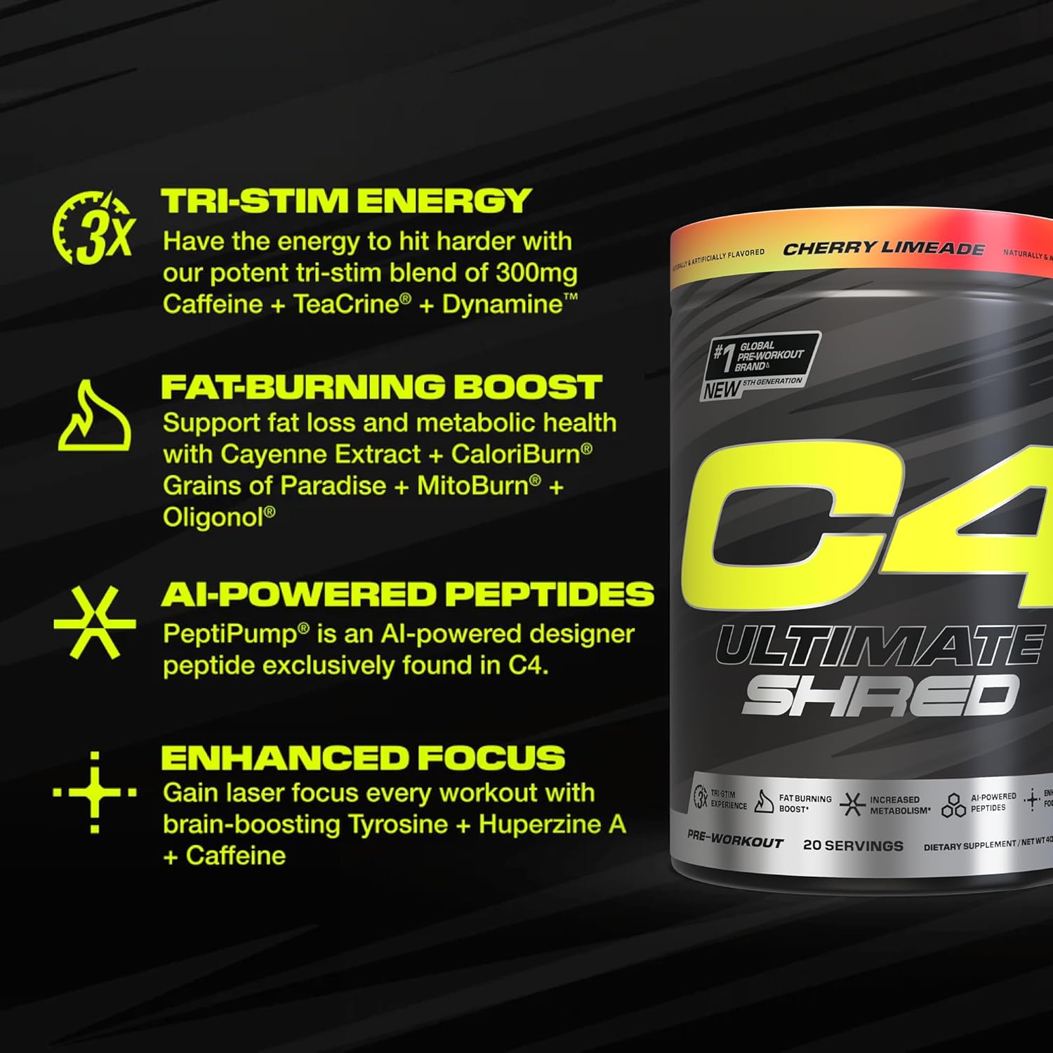 C4 Ultimate Shred fuels fat burning, performance, and muscular endurance with 300 mg of caffeine content