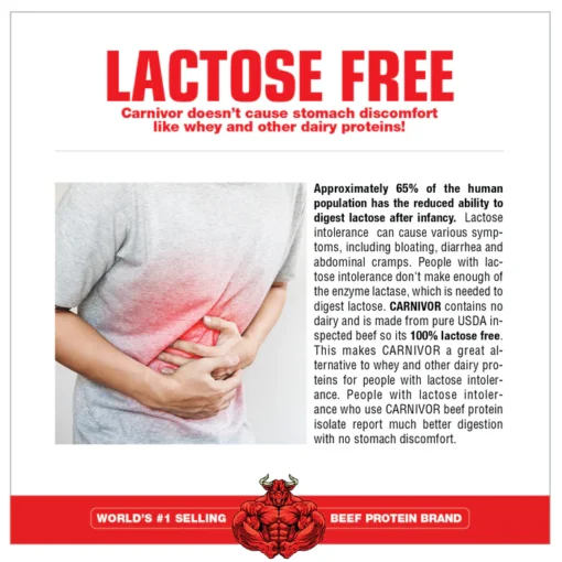 FACT: Nearly 70% of the global population is intolerant to lactose. Milk proteins such as whey and casein contain lactose and are poorly digested by most people, which can cause stomach distress and boating. Carnivor Beef Protein Isolate will resolve any gastric issues you are experiencing from whey and give you the quality protein you need to build muscle.