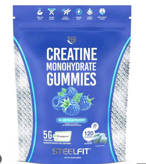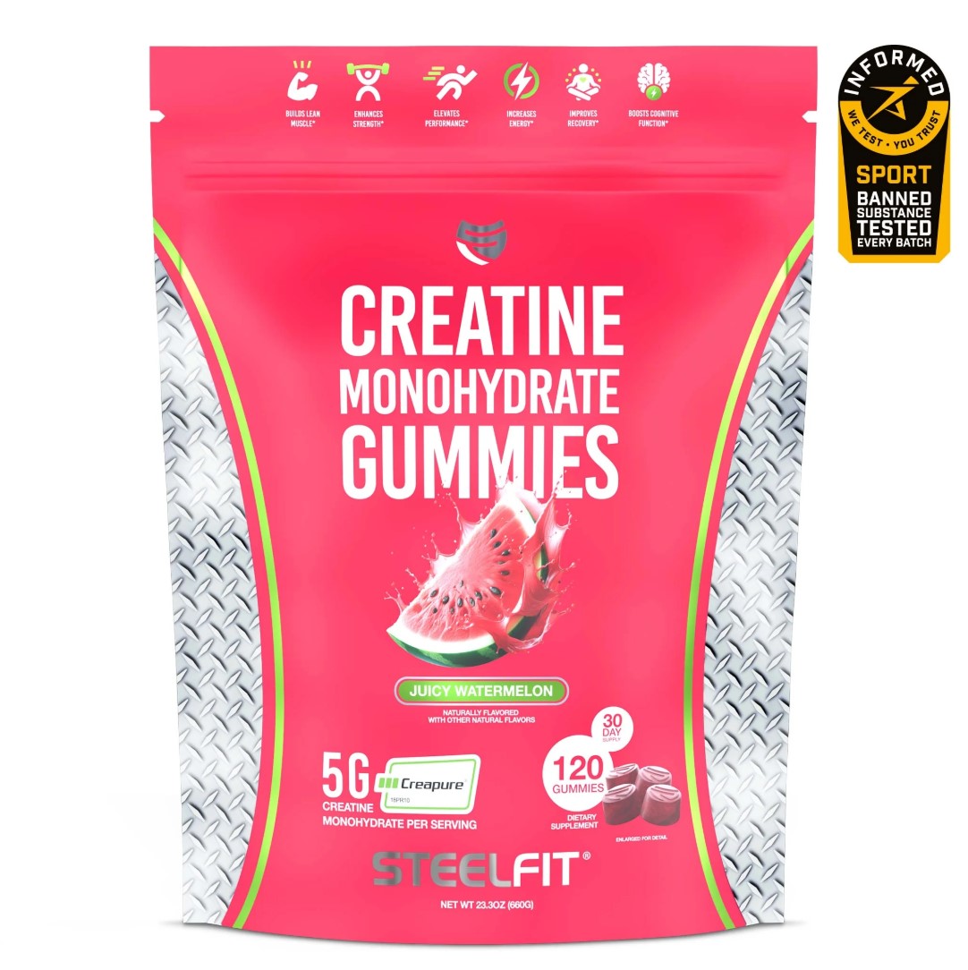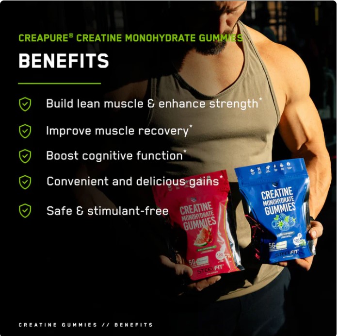 Elevate your workouts with SteelFit® Creatine Monohydrate Gummies! Each serving delivers 5G of Creapure® Creatine Monohydrate – The most researched and trusted form of creatine. Your fitness journey just got a whole lot tastier!