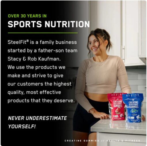 Elevate your workouts with SteelFit® Creatine Monohydrate Gummies! Each serving delivers 5G of Creapure® Creatine Monohydrate – The most researched and trusted form of creatine. Your fitness journey just got a whole lot tastier!