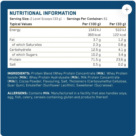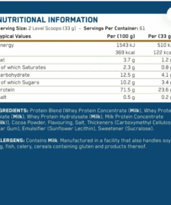 Choco Hazelnut – Protein Blend [Whey Protein Concentrate (Milk), Whey Protein Isolate (Milk), Whey Protein Hydrolysate (Milk), Milk Protein Concentrate (Milk)], Cocoa Powder, Flavouring, Salt, Emulsifier (Sunflower Lecithin), Thickeners (Carboxymethyl Cellulose, Guar Gum), Sweetener (Sucralose).