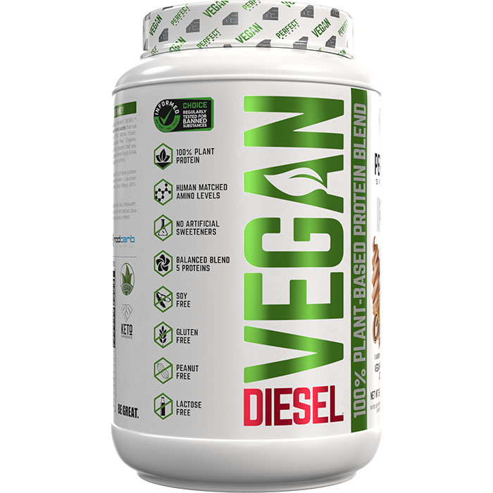 DIESEL® Vegan has your goals in mind! PERFECT Sports® has added ModCarb®, an expertly concocted mix of 6 organic ancient grains, with over 20% protein, to control cravings and truly fortify this Vegan protein. This isn’t some run-of-the-mill mix of pea protein; this mix is loaded with Organic Oat Bran, Amaranth, Quinoa, Buckwheat, Millet and Chia. ModCarb was just the start – PERFECT Sports® also added Organic Pumpkin Seed protein and Organic Sprouted Brown Rice protein to seal the deal. Stacking is the key to getting all of your aminos in and this