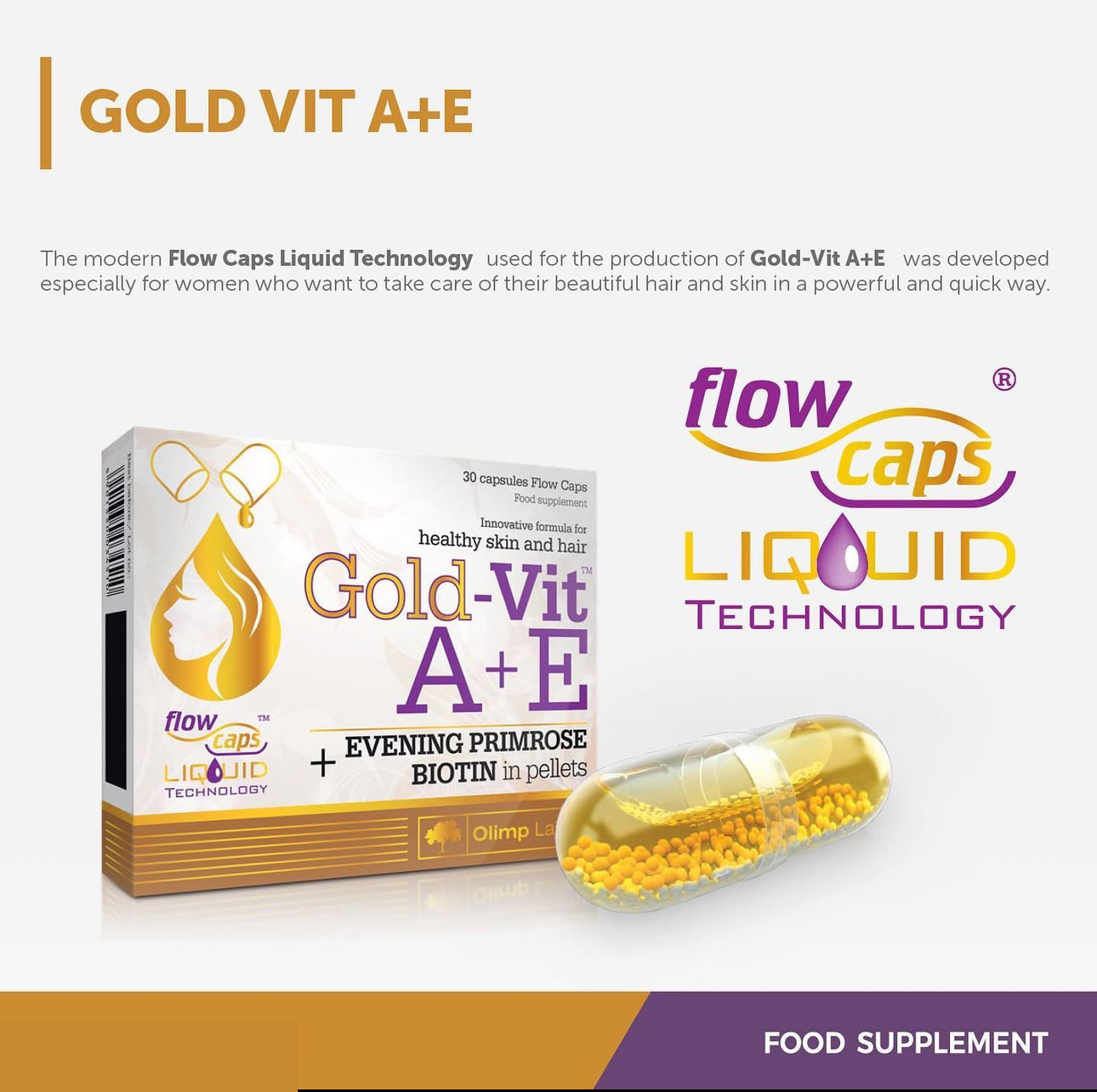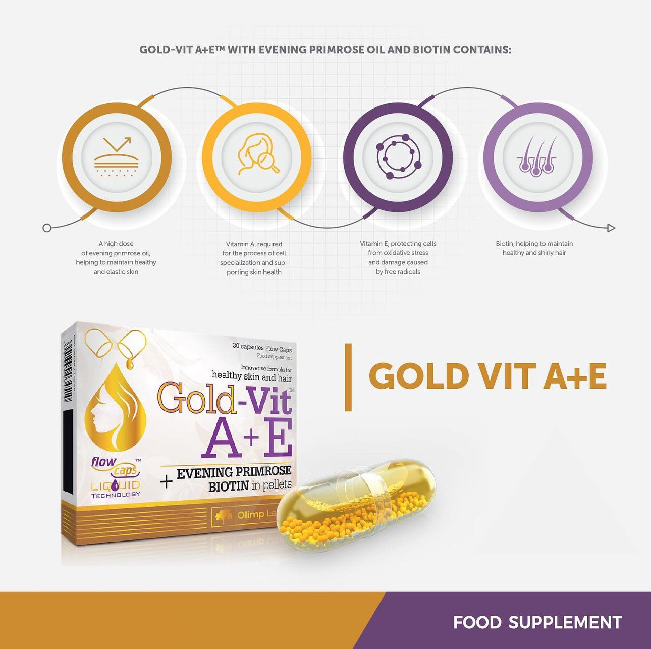 Gold-Vit A + ETM is a food supplement with a perfect composition for those who care about their skin and hair. A composition of vitamins A and E has been enriched with evening primrose oil, standardised to the content of gamma-linolenic acid (GLA), and biotin in the form of innovative micro-pellets which guarantee optimal speed of transport and absorption in the body.