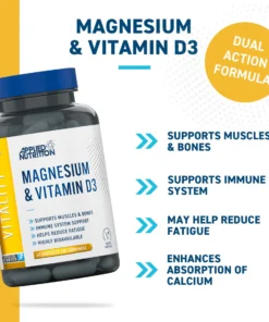 Support your daily health with Applied Nutrition Magnesium & Vitamin D3, a carefully balanced formula designed to contribute to the normal function of muscles, bones, and the immune system. Each serving delivers 280 mg of magnesium and 5 µg (200 IU) of vitamin D3, working together to support energy levels, reduce fatigue, and maintain electrolyte balance.