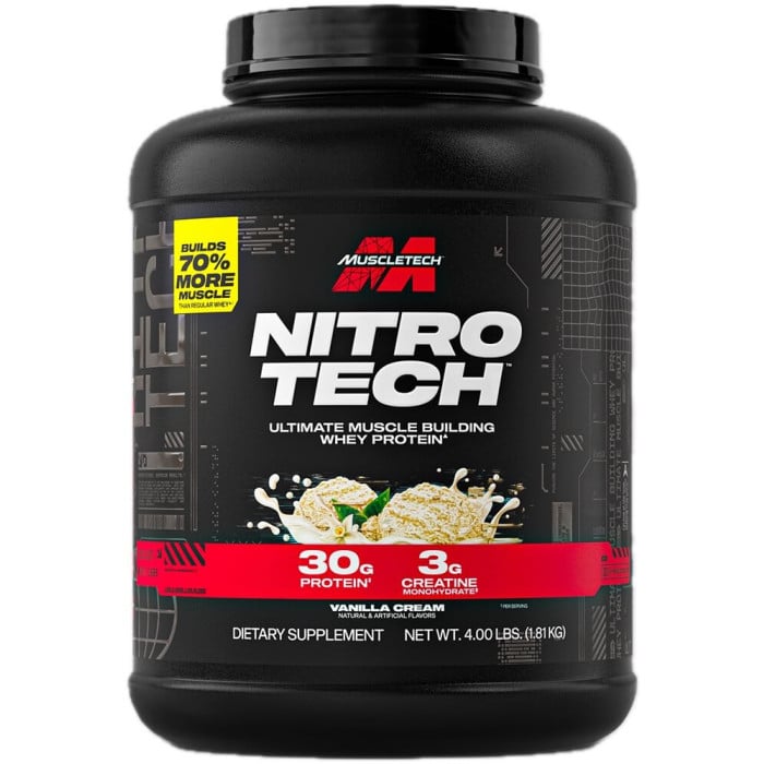 Nitro-Tech® redefines what whey protein can achieve with a scientifically engineered 30g whey + 3g creatine formula. Once protected by a 20-year patent, it’s clinically proven to build 70% more muscle than regular whey. In just 6 weeks, users gained 8.8 lbs. of lean muscle and added 34 lbs. to their bench press. More muscle. More strength. Better performance.